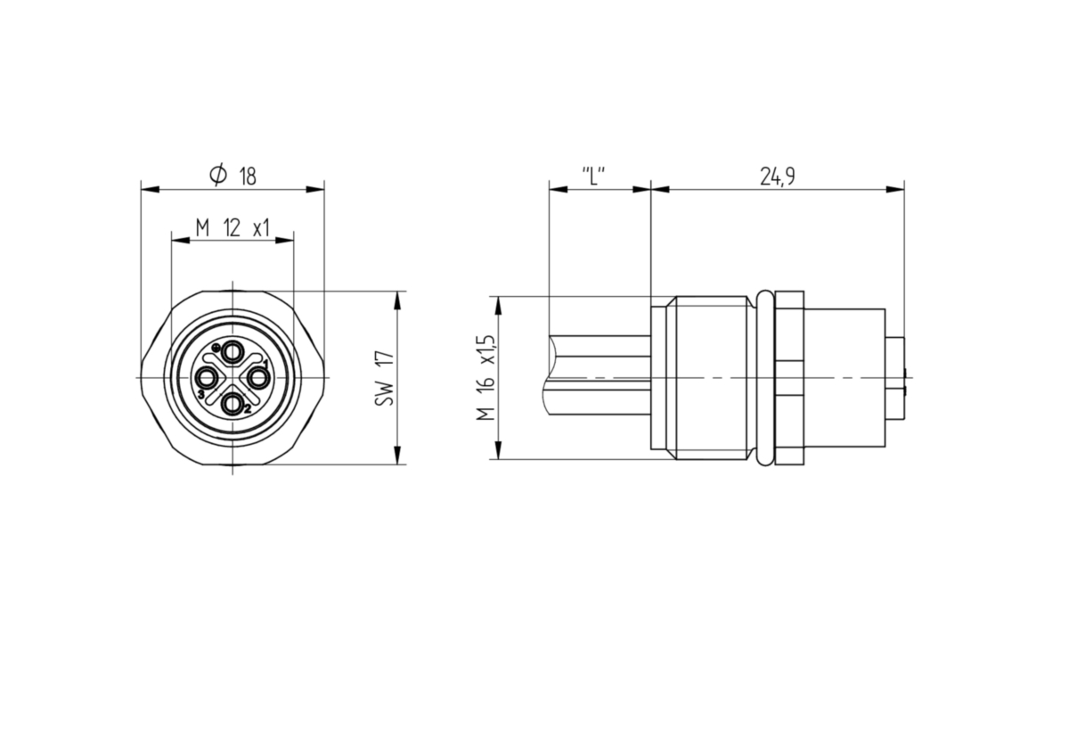M12 Power Receptacle Connector: Female, front mount, 4-pin(3+PE), S-coded, shielded, silver housing, 600 V AC/DC, 16 A