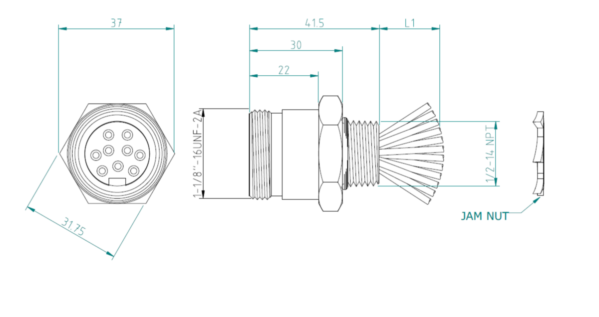(4)Receptacle | 1-1/8" - Female Straight | 1/2NPTF | #Contacts: 9 | 600 V / 7 A | Hookup Wires; 9x16 AWG; US | UL 2238; cURus