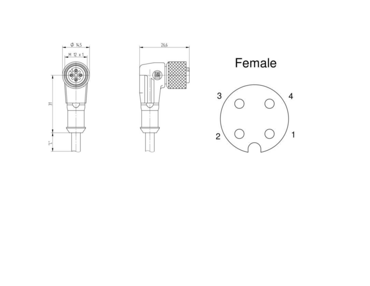 (4)M12 Standard Sensor/Actuator Single-Ended Cordset: Female, angled, 4-pin, A-coded, translucent body, 230 V AC/DC, 4 A; PU black cable, 4-wires, 0.34 mm²