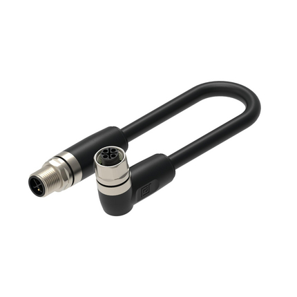 M12 to M12 cordset, Industrial Power Applications, PVC black cable, unshielded, AWM: 2587, male to female, straight to angled, S-coded, 4-pin, 4x1.5 mm², 600 V AC / DC operating voltage, rated current 16 A, -40 °C ... 125 °C (operating temp.), suited for IP65, IP67 environment, IEC 61076-2-111, UL 2237; cULus