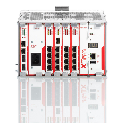 The XTran node consists of a 3 U (3 U = 132.5 mm = 5.22 inches) high, 19 inches rack or DIN rail mountable stainless steel chassis. Each node type has a modular structure. The XT-1104-A node chassis can be equipped with 1 Power Supply Unit (PSU), 4 Interface Modules (IFM), 1 Central Swichting Module (CSM) and a Node Support Module (NSM).