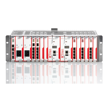 The XTran node consists of a 3 U (3 U = 132.5 mm = 5.22 inches) high, 19 inches rack or DIN rail mountable stainless steel chassis. Each node type has a modular structure. The XT-2209-A node chassis can be equipped with 2 redundant Power Supply Units (PSU), 9 Interface Modules (IFM), 2 redundant Central Swichting Module (CSM) and a Node Support Module (NSM). IFM slot 3 is optimized for a 9-L3A-L IFM (which is wider than normal IFMs) but can also be used for normal IFMs.