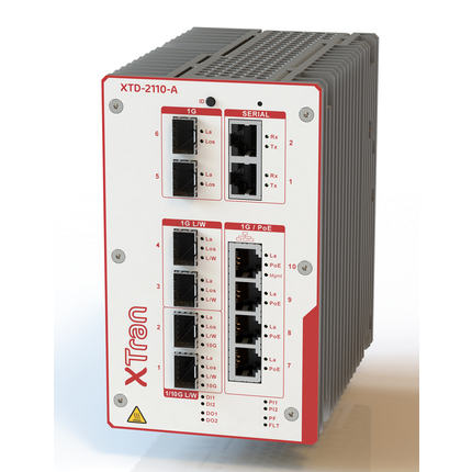 The XTD-2110-A is the most compact member of the XTran product family. It combines MPLS-TP transport on the backbone with Layer 2 and Layer 3 features on the Ethernet access ports in an integrated industrial IP20 housing which can be mounted on a DIN rail. The XTD-2110-A provides a total of 10 Ethernet ports and 2 serial ports. The XTran Access node has a ruggedized design and is compliant with the EMC standards. XTD-2110-A nodes can be used to build a stand-alone network, or they can be used as an MPLS access network in combination with modular XTran Core and Aggregation nodes.