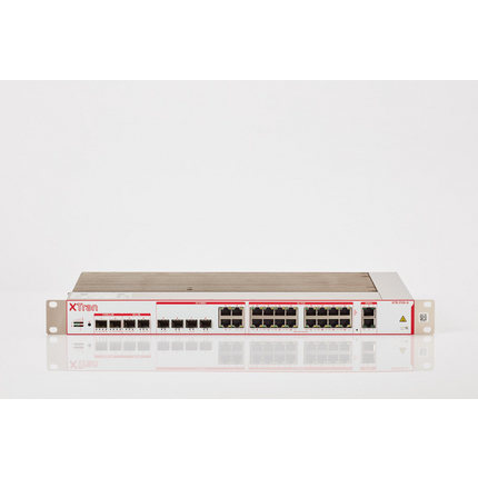 The XTR-2124-A is a rack mounted High-Port Density network device which is part of the XTran product family. It combines MPLS-TP transport on the backbone with Layer 2 and Layer 3 features on the Ethernet access ports in an integrated industrial IP20 housing which can be 19” rack mounted. The XTR-2124-A provides a total of 24 Ethernet ports and 2 serial ports. The XTran Access node has a ruggedized design and is compliant with the EMC standards. XTR-2124-A nodes can be used to build a stand-alone network, or they can be used as an MPLS access network in combination with modular XTran Core and Aggregation nodes.